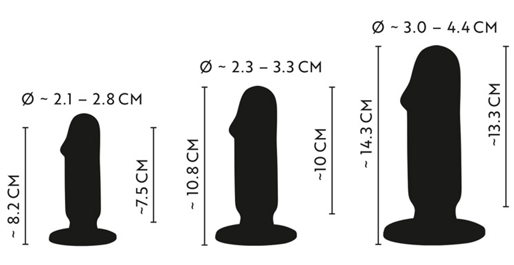 Butt Plug Training Kit van ANOS met 3 buttplugs met verschillende maten en gewichten voor plezierige stimulatie of stretching en training van de anus. Elke flexibele plug heeft een realistisch gevormde eikel en een grote zuignap, waardoor hij veilig (langdurig) kan worden gedragen zonder te ver naar binnen te glijden. De pluggen zijn ook perfect voor handsfree plezier.