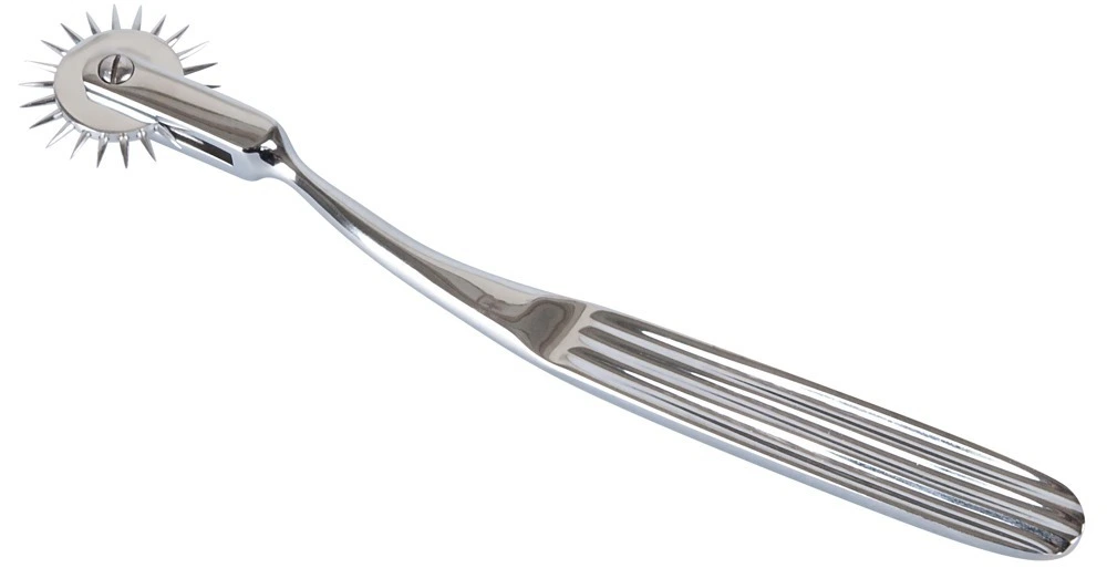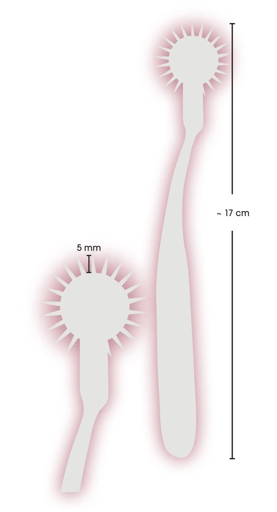 Het pinwheel is een handig hulpmiddel voor opwindende sensaties op huid en geest. Volledige grootte (ongeveer): 18 cm. Spike lengte (ongeveer): 0,5 cm. Materiaal: verchroomd messing.