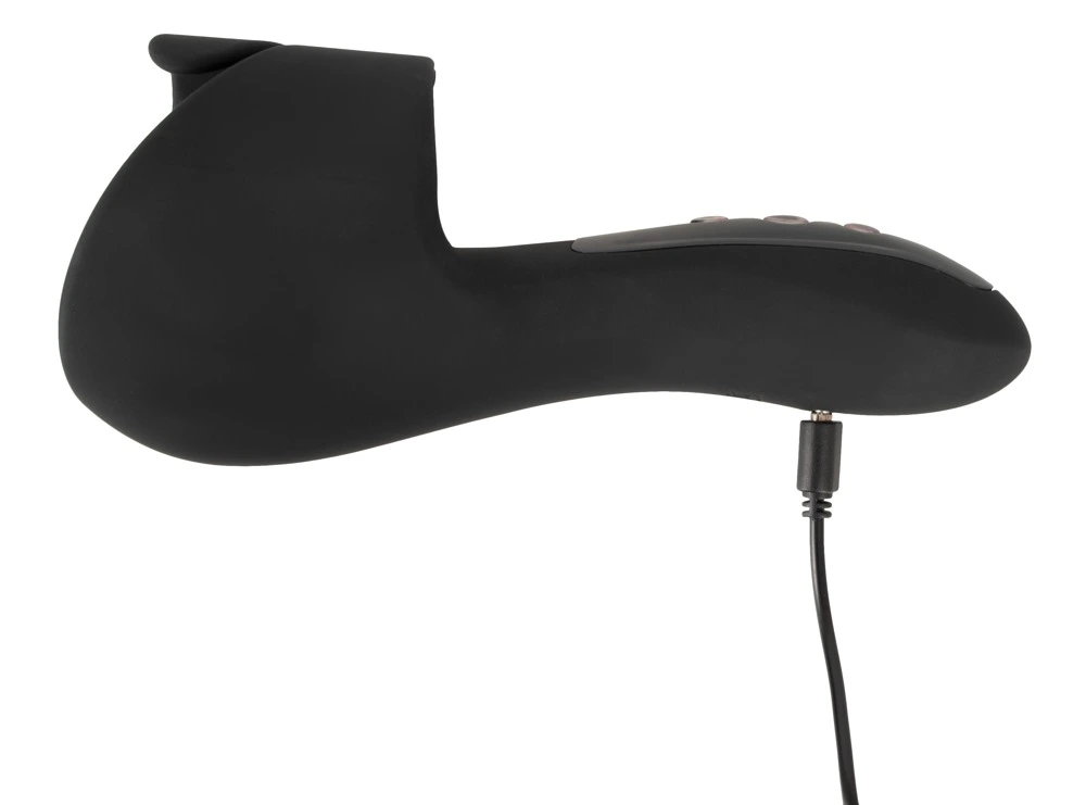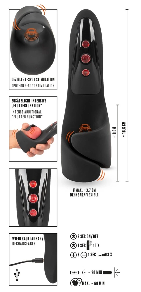 Compact masturbator with flexible wings that hold the penis securely. It provides amazing stimulation thanks to its 10 vibration modes in 3 speeds and a throbbing/pulsating knocking function directly on the sensitive frenulum (elastic band of tissue under the glans) for intense orgasm – even with erectile disfunction. The modes and speeds of the vibrations can be controlled separately with the buttons on the toy. The masturbator can also be enjoyed in the bath or the shower because it is waterproof. The high-quality silicone feels great against the skin during masturbation. It can be recharged with the included USB cable.