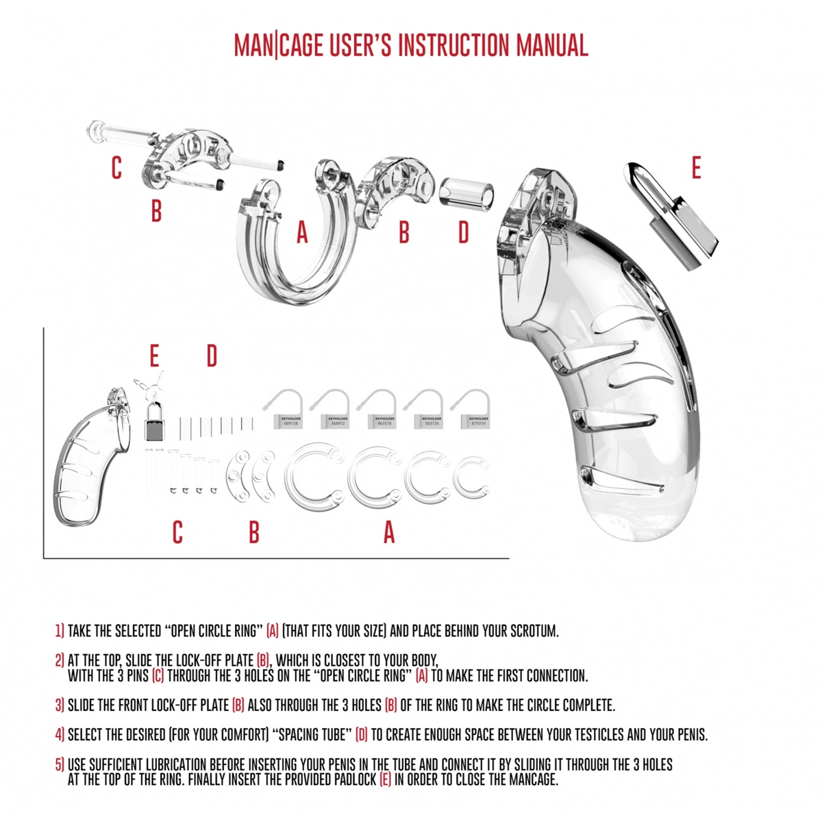 De Man|Cage Chastity Cages zijn gemaakt van polycarbonaat van hoge kwaliteit, en dat is een zeer licht, duurzaam en hypoallergeen materiaal. De kooi bestaat uit drie delen die perfect op elkaar aansluiten. De twee geleide pennen sluiten de bovendelen aan, en de ovale borgpen sluit de ringen op de kooi aan.