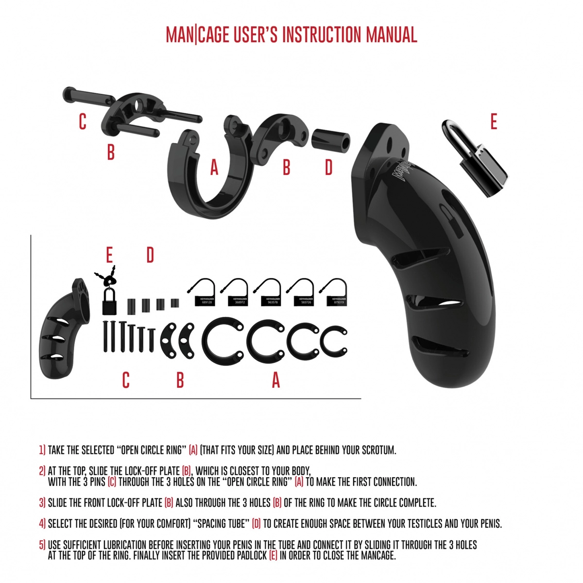 Dankzij verscheidene ringen in verschillende maten en opvullers kunt u de perfecte maat creëren. De ringen zitten comfortabel en zijn gegarandeerd veilig. Met een metalen slotje of kabelbinder kunt u de kooi makkelijk vergrendelen. De meegeleverde snelbinders zorgen ervoor dat het alarm op feesten, festivals en zelfs luchthavens niet afgaat.