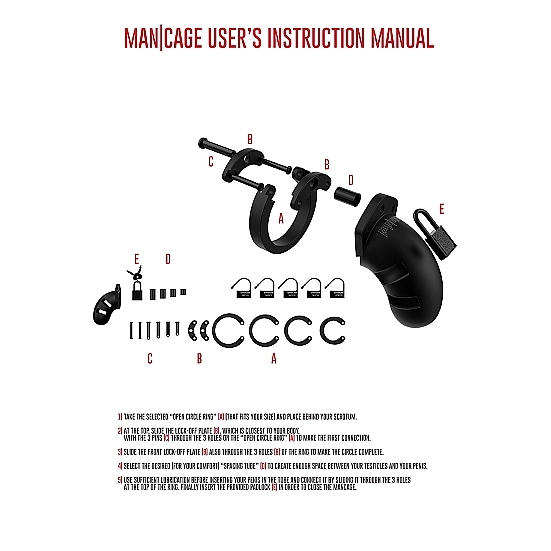 Hij is op meerdere punten verstelbaar en verkrijgbaar in twee maten. Er zijn vijf verschillende ringen en verschillende afstandhouders om het perfect te meten. Het heeft functionele openingen voor ventilatie en toiletgang en is gemakkelijk schoon te maken. Deze Mancage wordt geleverd met verschillende plastic sluitingen, die kunnen worden gebruikt als extra discretie vereist is (zoals veiligheidscontroles). Deze sloten kunnen worden losgemaakt wanneer het tijd is voor de ultieme ontgrendeling. Er wordt ook een stevig metalen slot meegeleverd.