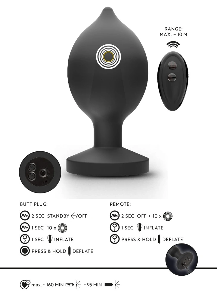 Trilling (10 standen), pompfunctie en ontluchtingsfunctie kunnen afzonderlijk worden bediend via de draadloze afstandsbediening (bereik tot 10 meter) of direct op het speeltje met een druk op de knop. De vibro-plug blaast zichzelf in 6 stappen iets verder op – tot een maximale diameter van 8 cm! Het volume van de vibro-plug kan met een druk op de knop weer eenvoudig worden verlaagd.
