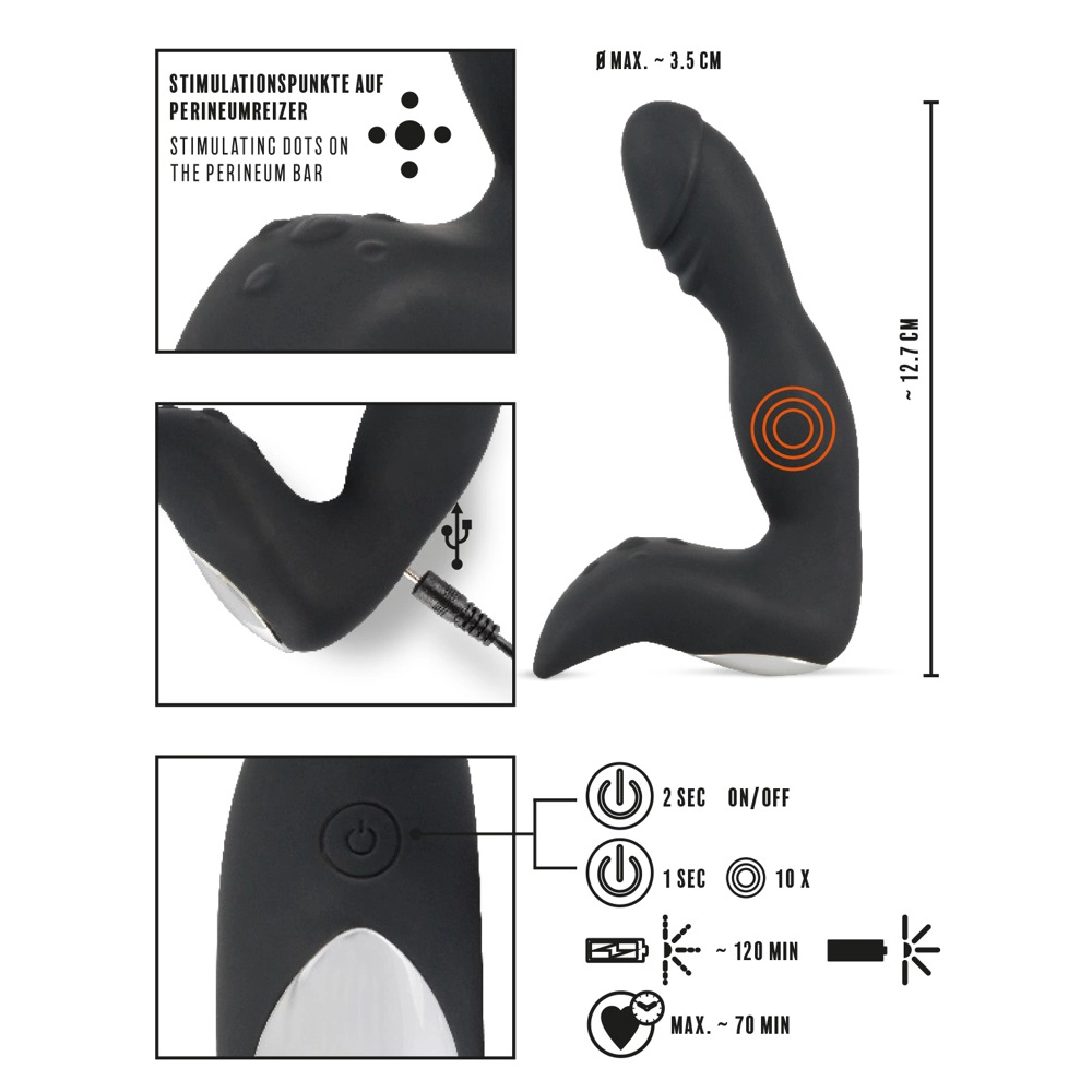 Prostaat vibrator met perineum stimulator. Stimuleert tegelijkertijd de prostaat en perineum met 10 intense vibratiemodussen. De top is extra flexibel voor een uiterst gemakkelijke penetratie. Het opwindende ontwerp met uitstekende top en stimulatiegroeven zorgen voor extra genot.