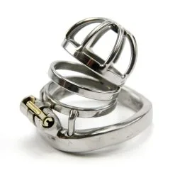 Medium grote roestvrij stalen kuisheidskooi met anatomisch gevormde ring. Deze kooi wordt stevig afgesloten met een handig cylinderslotje; weg met onhandige, rondzwaaiende hangsloten! Nu ook met optionele afneembare catheter!