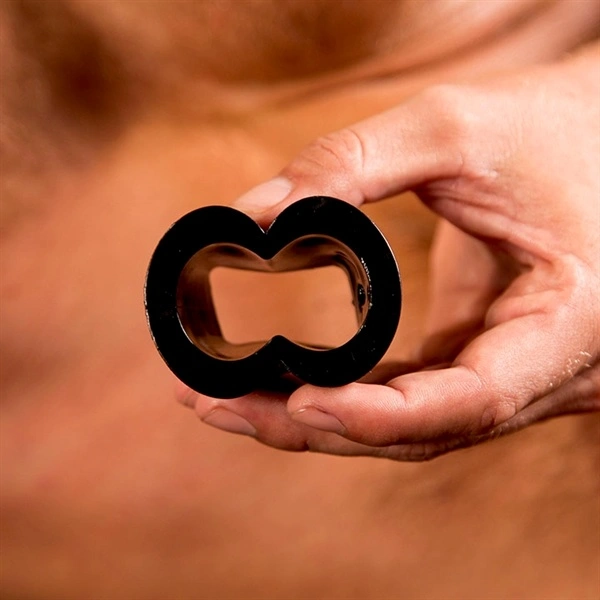 This is a wider ring designed as a ball stretcher. It has an unusual shape and because of this it fits very well. It is not as tight as the others in the line, but it is pretty wide. It is pretty comfortable. It could also be used around the balls and shaft as a cockring at the same time if that’s what you prefer.
